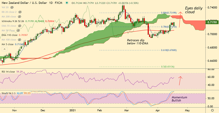 Decisive break above daily cloud will fuel further gains. On the flip side, 5-DMA is immediate support at 0.7135. Breach below 110-EMA negates any upside bias.