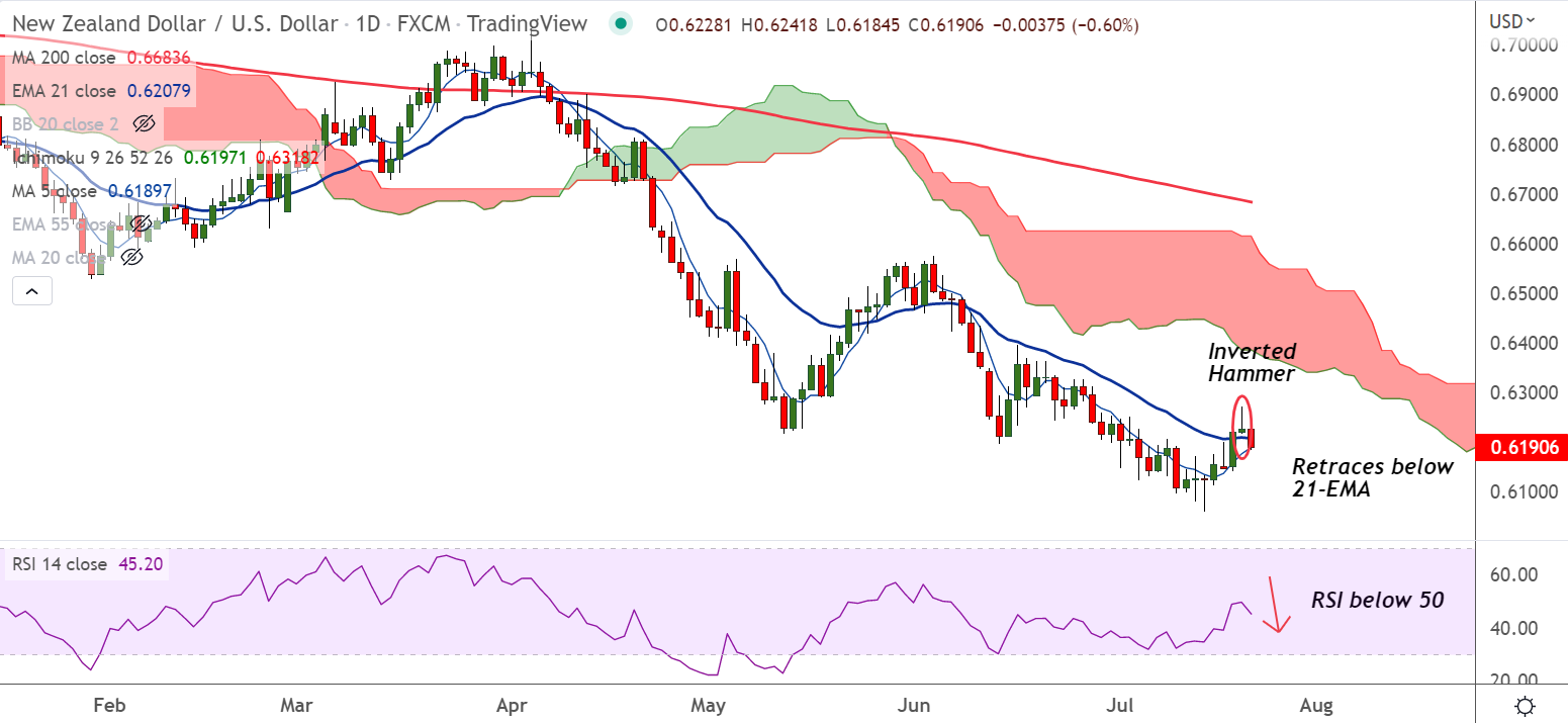 The pair has retraced break above 21-EMA after 'Inverted Hammer' formation on the previous session's candle.