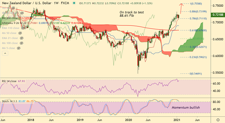 NZD/USD was trading 0.74% higher on the day at 0.7222 at around 12:00 GMT, bias bullish.
