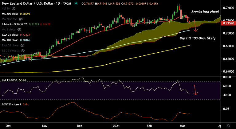 Scope for dip till 100-DMA at 0.7046. Break below will see further downside. Focus on U.S. NFP data for impetus.