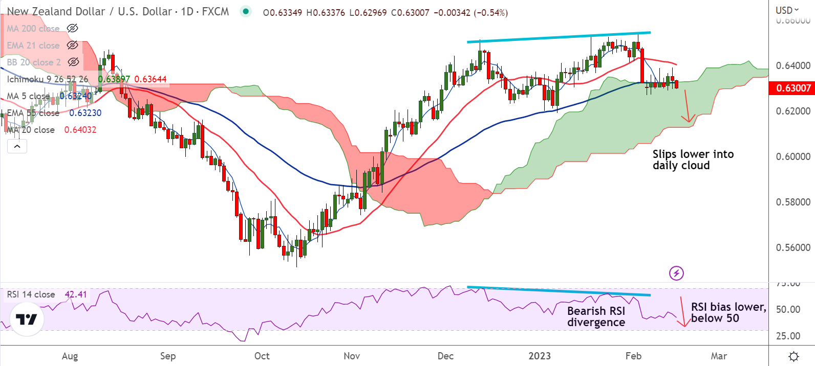 NZD/USD is extending weakness for the 2nd consecutive session, slips further into the daily cloud.
