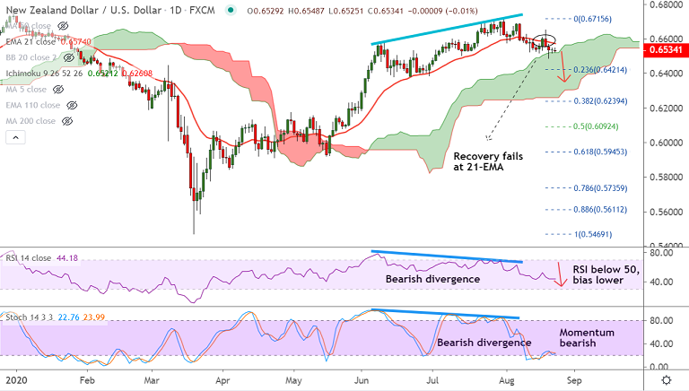 On the flipside 5-DMA is capping upside at 0.6551. Above 5-DMA, 21-EMA offers major resistance at 0.6573. Decisive break above 21-EMA could see further gains.