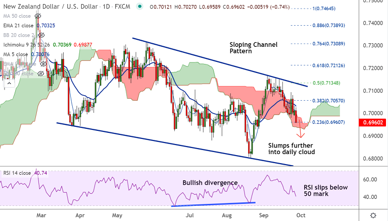 Technicals for the pair support more downside. Price action has slipped below 55-week EMA support at 0.6971.
