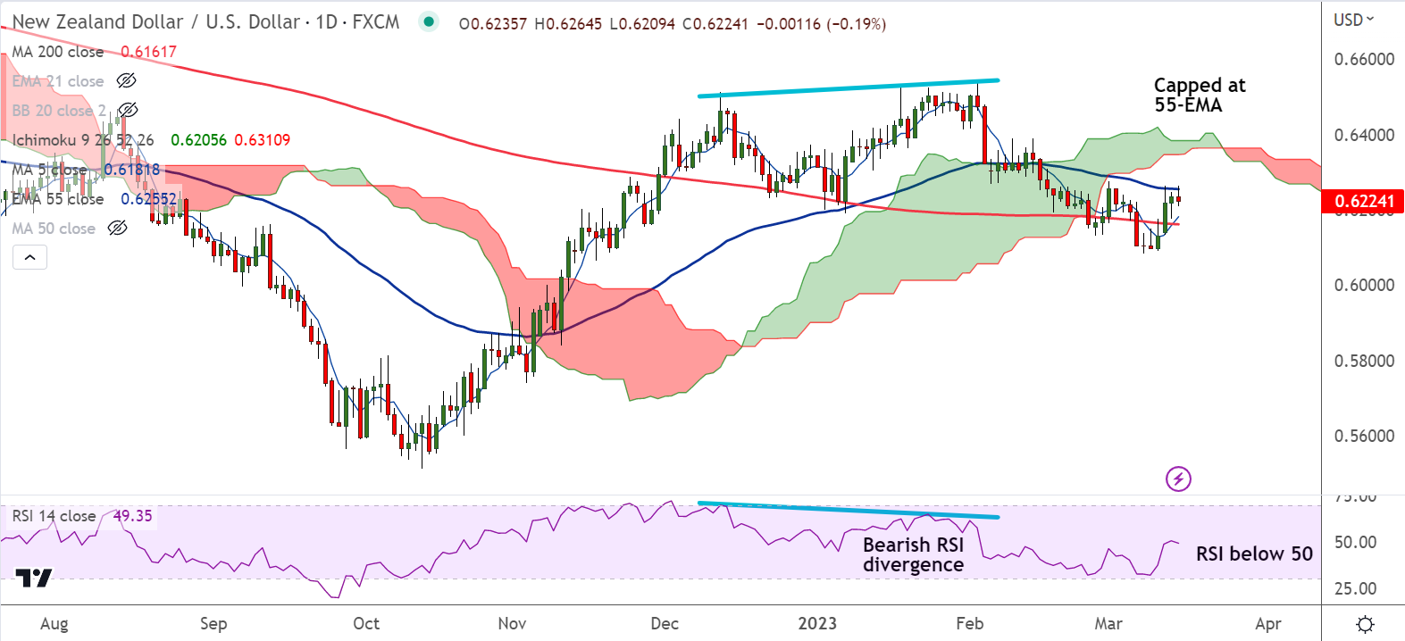 Summary: NZD/USD struggles for direction below 55-EMA. Bulls lack upside conviction. Decisive break above 55-EMA could change near-term bias.