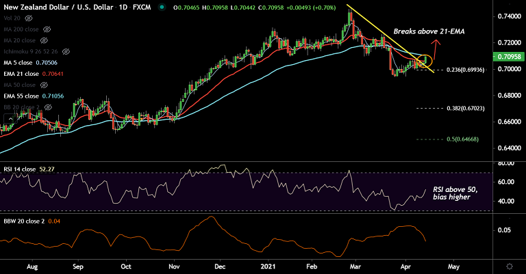 NZD/USD is trading shy of 0.71 handle and 55-EMA resistance (0.7105). Decisive break above will buoy bullish bias.