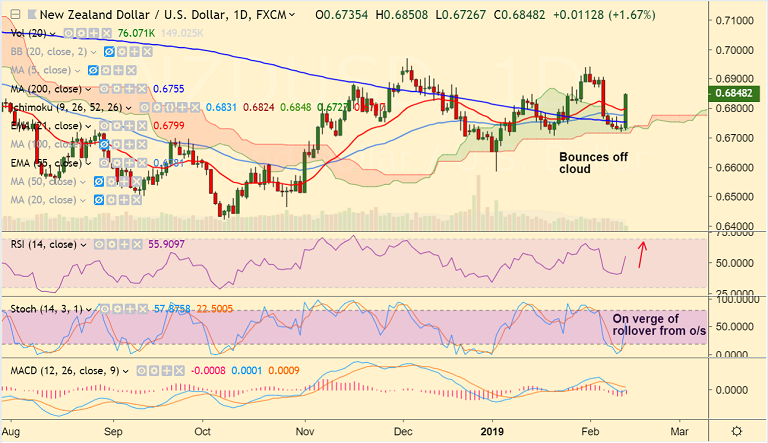 - NZD/USD is currently trading at 0.6849, up 1.70% at the time of writing. The pair has bounced off cloud support and has retraced dip below 200-DMA.
