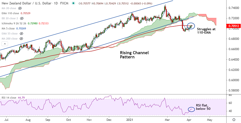 Kiwi bulls largely unimpressed despite upbeat China's Caixin services PMI for March which showed a solid increase in services activity.
