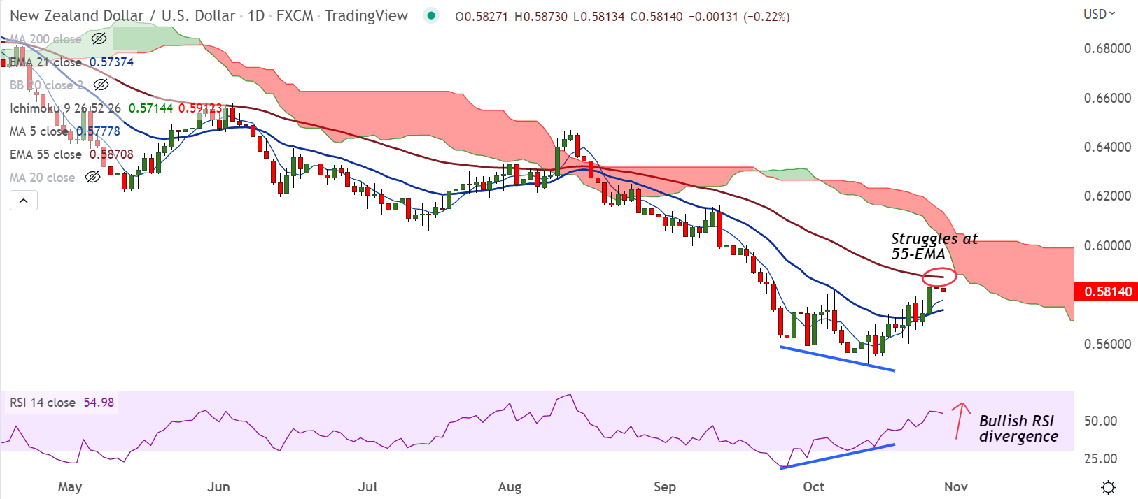 NZD/USD was trading 0.57% lower on the day at 0.5794 at around 10:05 GMT. Outlook still bullish.