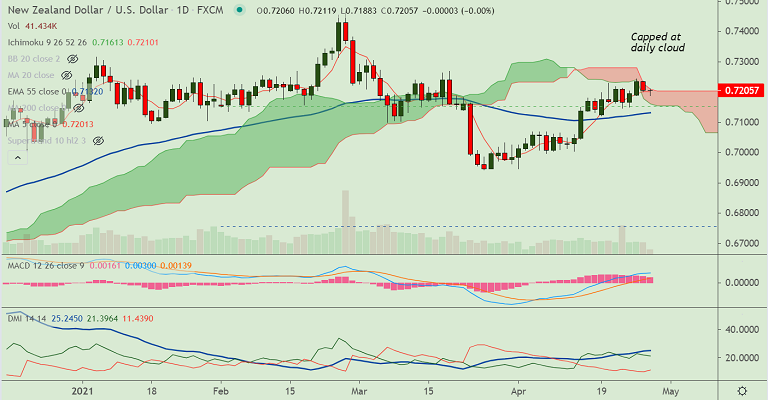 Daily cloud caps upside, overbought oscillators warrant caution, scope for some pullback. Next major support lies at 21-EMA at 0.7144.