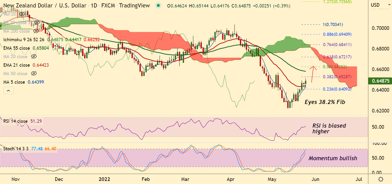 Summary: NZD/USD was trading with a bullish bias. Scope for test of 38.2% Fib at 0.6528