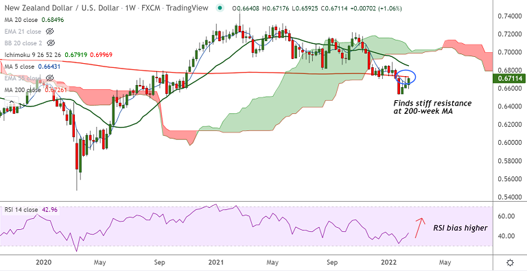Summary: NZD/USD trades with a bullish technical bias. Watch out for breakout at 200-week MA resistance for upside continuation.