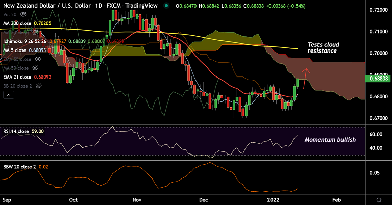 - The pair has broken above 55-EMA, momentum is bullish and volatility is rising. Scope for test of 110-EMA at 0.6925.