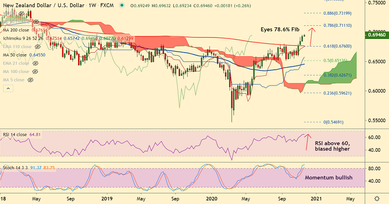 On the flipside, 5-DMA is immediate support at 0.6919. Break below could see minor weakness. Retrace below 200W MA will negate any bullish bias.