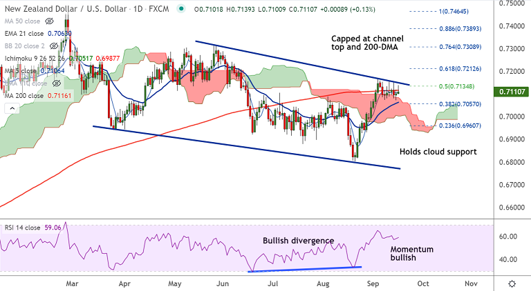 Focus on US FOMC meeting for impetus. Decisive break above 200-DMA and channel top will buoy bulls in the pair. Retrace below cloud negates any further upside.