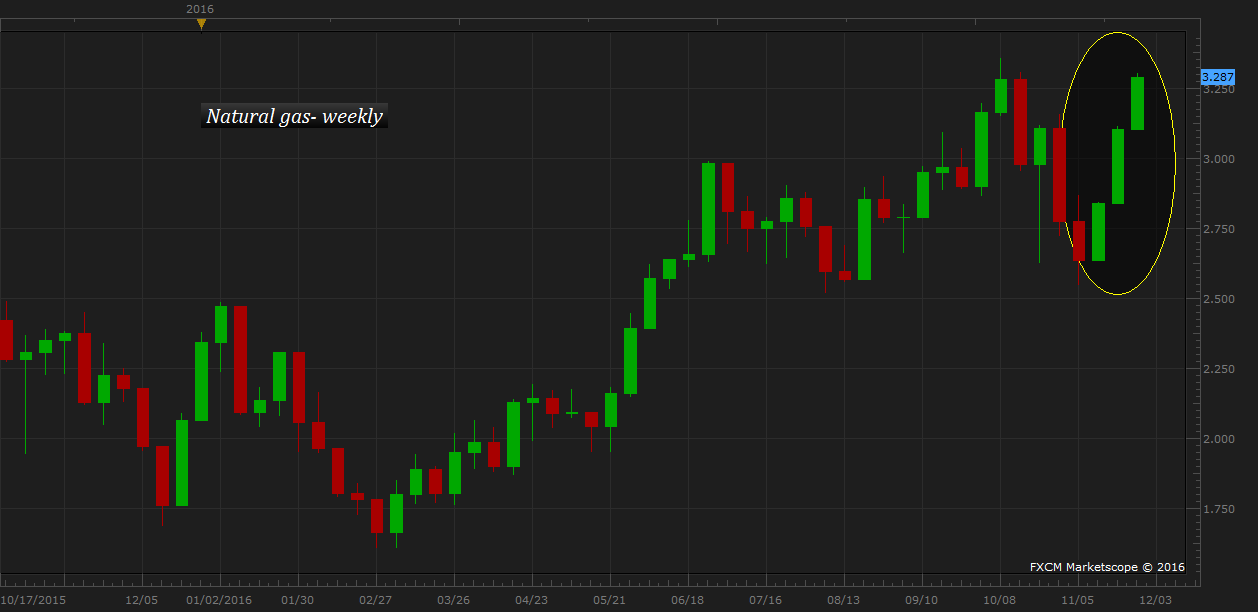 In our call review on 18th October FxWirePro: Keep riding the gas (call review), we reviewed our long call in natural gas and recommended to keep riding the bullish call, where we recommended a buy at $2.6 per MMBtu, with targets at $3.1, $3.7, $4.3, and $5.2. We don’t expect the natural gas to reach all these levels in this winter. While gas prices were dropping sharply during late October and early November, we recommended keep going and buying at dips.
