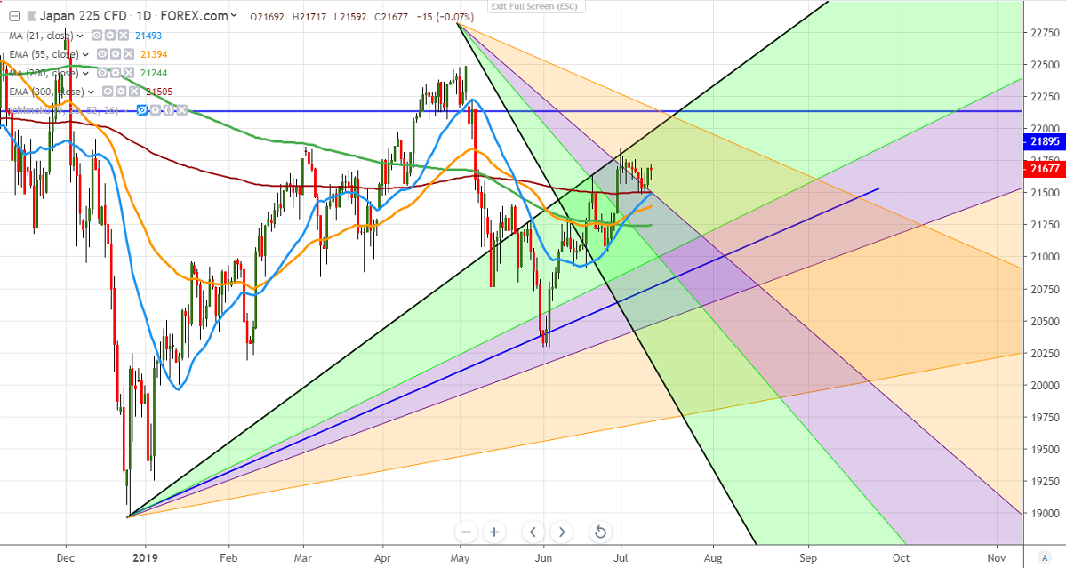 Nikkei is trading flat for the past 10 days amid strong US markets. It is trading between 21846 and 21497. ECB meeting minutes show that the central bank is ready for easing and US CPI came at the highest level in 1-1/2 years. The index hits high of 21717 and is currently trading around 21682.