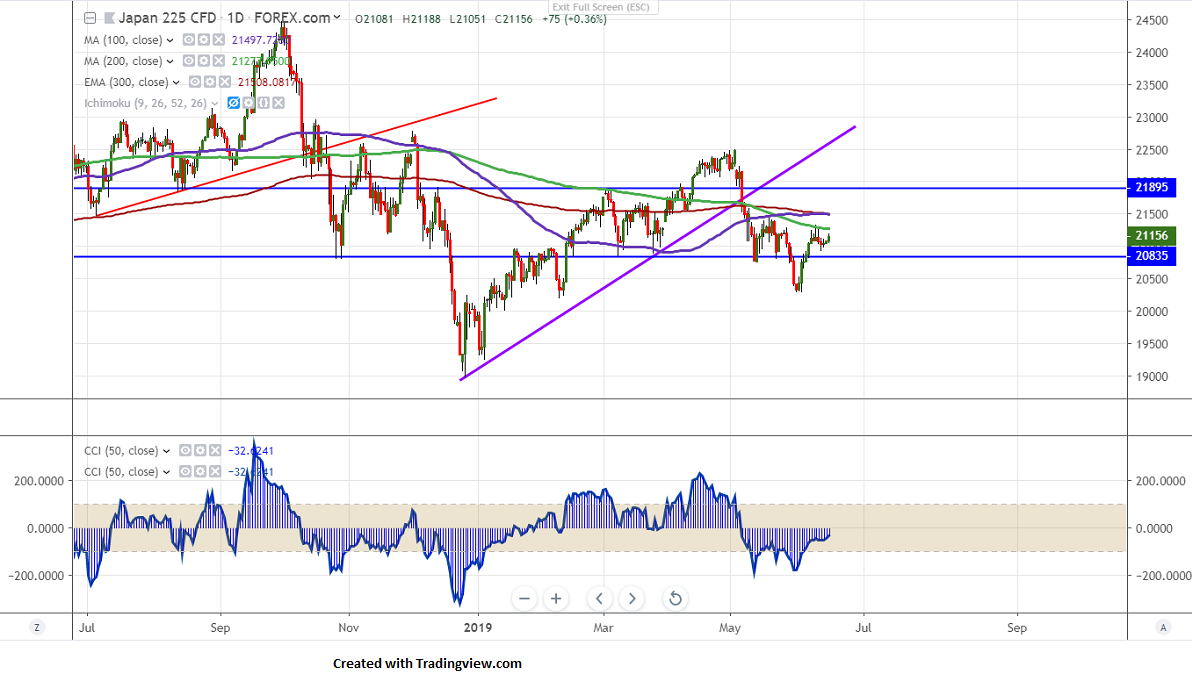 Nikkei is consolidating between 21330 and 20971 for past 3 trading days. The index is holding above 21000 level. It is currently trading around 21141.