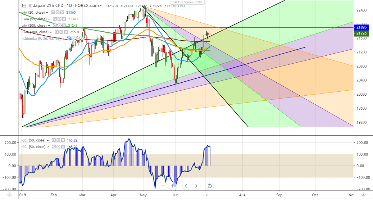 Nikkei is trading flat for the past 3 trading days. The index gained nearly 2% after US-China has agreed to restart trade talks has increased hopes of a deal. With US markets closed yesterday on account of independence, trading remains subdued. Investors await US Non-Farm Payroll data which is to be released today for further direction. The index hits an intraday high of 21733 and is currently trading around 21701.
