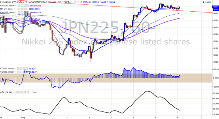 - Nikkei225 has slightly retreated after making a high of 16740 yesterday. It is currently trading around 16686.