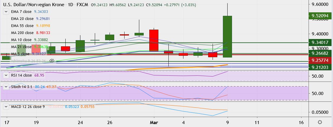 - USD/NOK trades 3.05 percent higher at 9.5238, having touched an all-time high of 9.6056 earlier in the session.