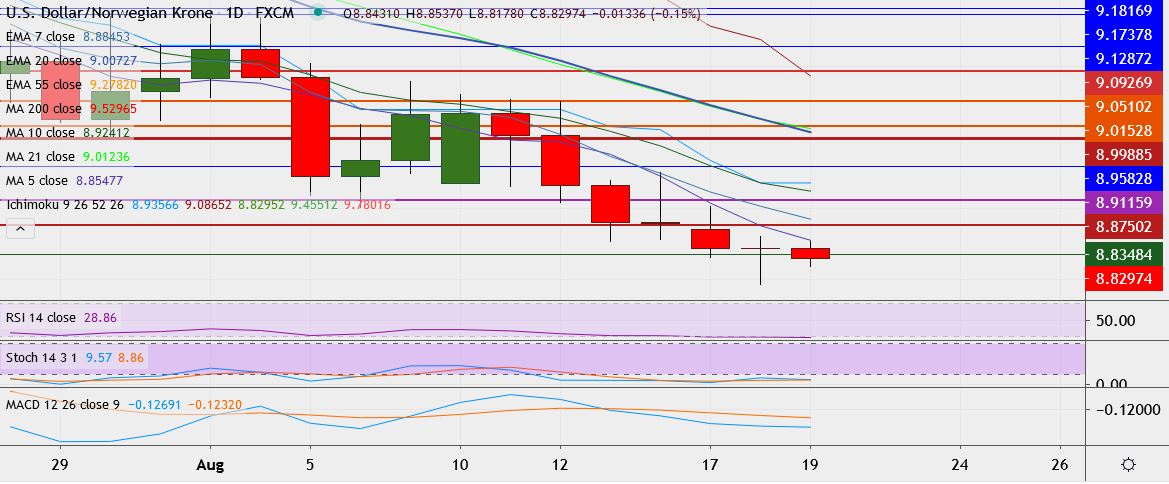 - Immediate resistance is located at 8.8752 (5-DMA), close above could take it till 8.9028 (7-EMA).