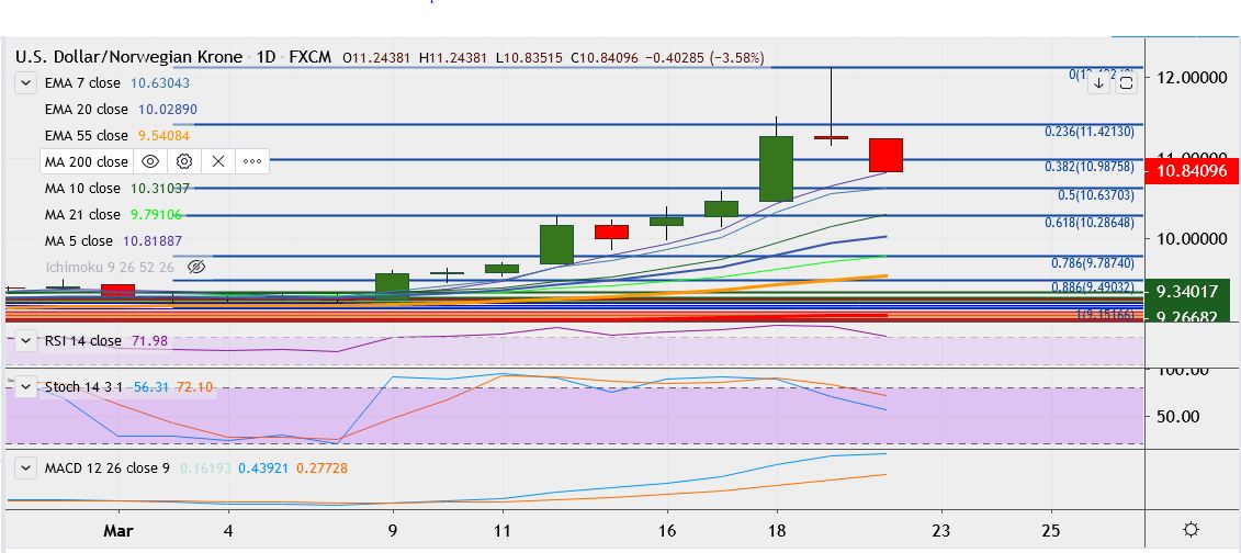 - USD/NOK trades 3.1 percent lower at 10.9009, having touched an all-time high of 12.1224 the day before.
