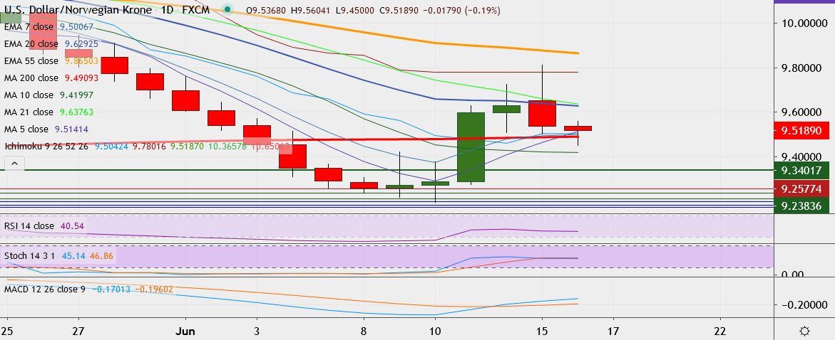 - USD/NOK trades 0.2 percent lower at 9.5160, having touched a high of 9.8119 the day before, its highest May 28.