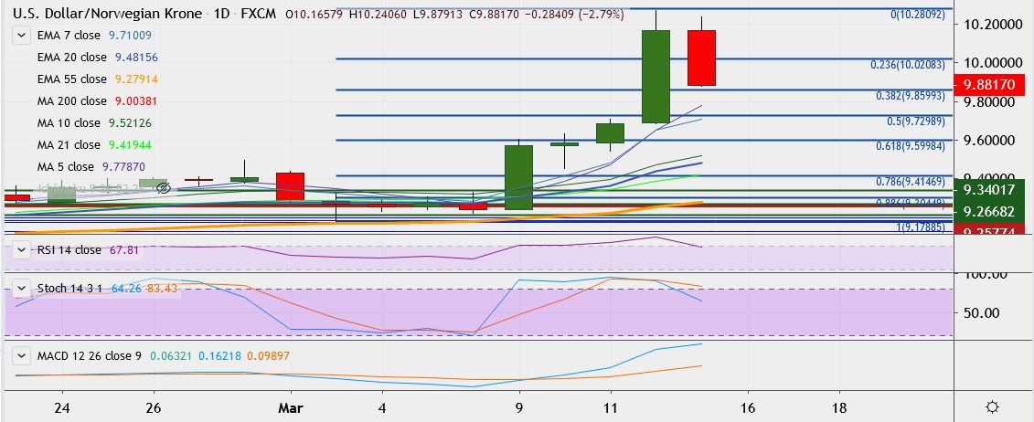 - On the downside, support is around 9.8599 (38.2% retracement of 9.1788 and 10.2719), break below could take it till 9.7298 (50% retracement)