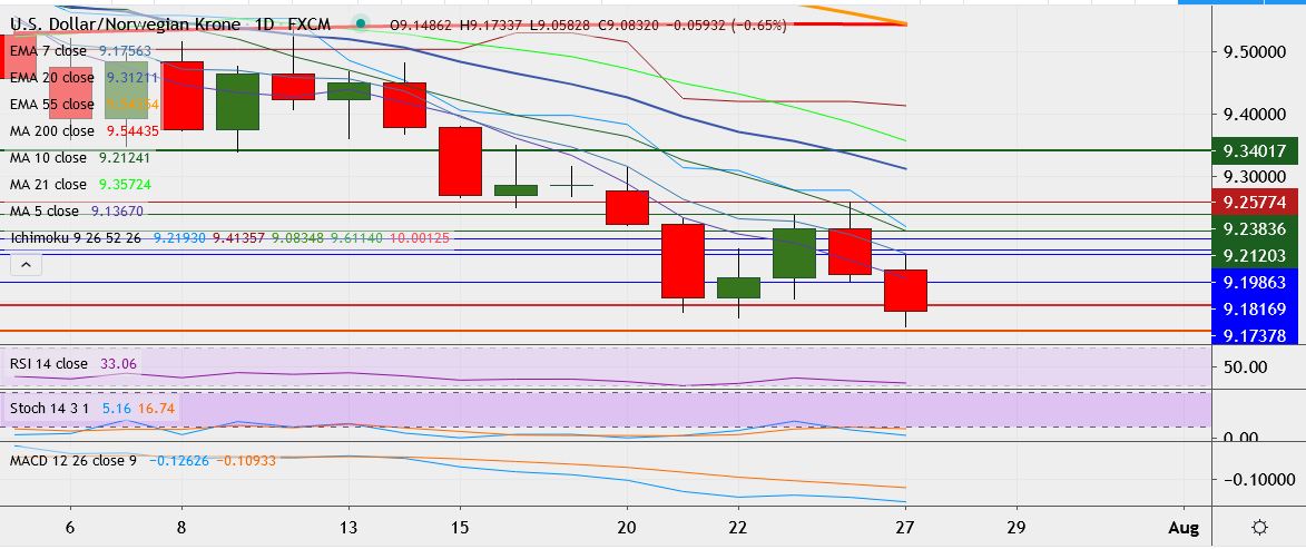 - USD/NOK trades 0.7 down at 9.0833, having touched a low of 9.0582 earlier, its lowest since Jan 27.