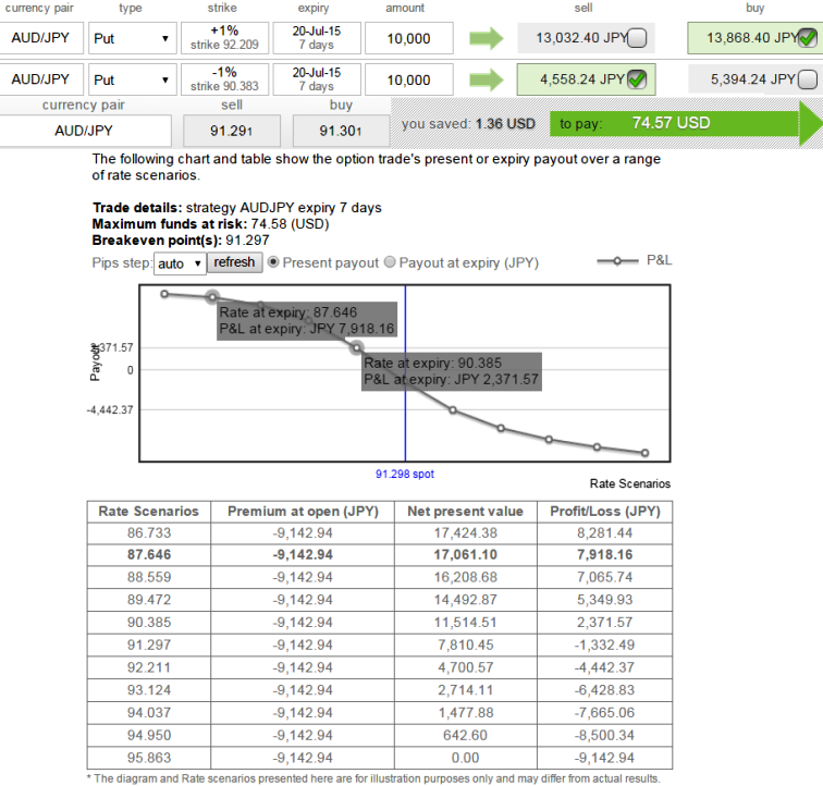 Even though binary calls of this pair looks quite attractive today, on hedging grounds as we are sensing bearish trend on the rallies of AUDJPY currency pair, thus one could get benefited from downswings in near future by taking shorts on futures of this pair. With a trend being bearish bias we still recommend buying 7D (1%) In-The-Money -0.68 delta put option while sell 7D (-1%) Out-Of-The-Money put options for a net debit (something like USD 9309.68 as shown in the diagram).