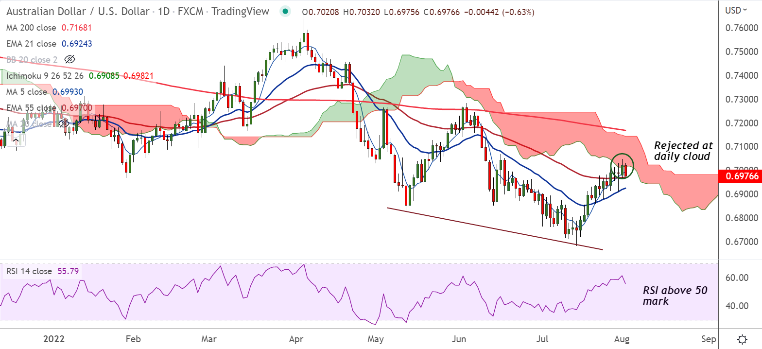 Summary: AUD/USD finds stiff resistance at daily cloud base. The major has surrendered the crucial support of 0.7000. Immediate support is seen at 200H MA at 0.6956. Break below 200H MA will see more weakness.