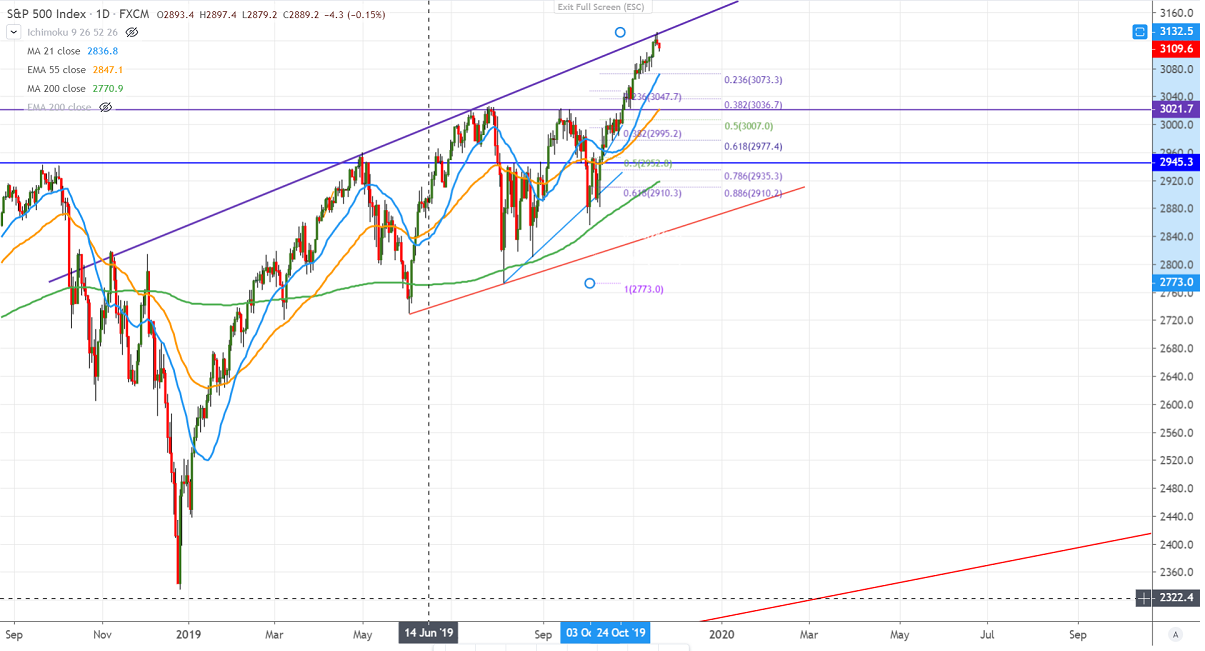 S&P500 has halted its 1-1/2 month bullish trend and shown a minor decline. The index jumped more than 250 points on account of easing US-China trade tension. But slight pessimism in the deal is putting pressure on the global stock markets. It hits low of 3104 and is currently trading around 3107.20.