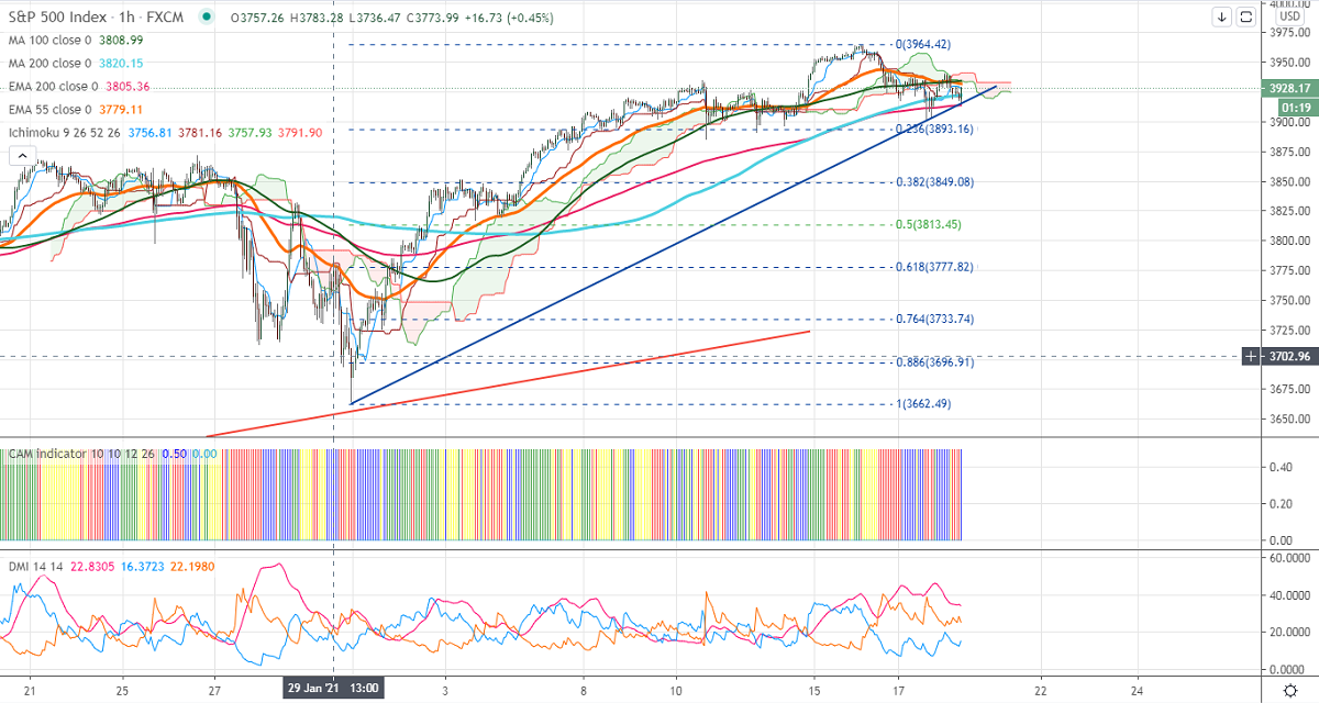 S&P500 was one of the best performers this month and surged more than 8% on upbeat market sentiment. The corona vaccine rollout, hopes of more U.S stimulus, and decline in COVID-19 cases have increase demand for risk appetite. US retail sales rose 5.3% in Jan m/m, the highest jump in the seventh months. The data came much better than the estimate of 1.1%. Market eye US initial jobless claims and Philly fed manufacturing index for further direction. The index hits a fresh all-time high of 3965 and is currently trading around 3927.
