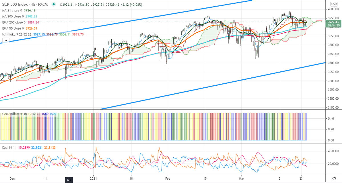US durable goods orders declined by 1.1% in February compared to a forecast of 0.7%, the first time since Apr 2020. The flash manufacturing PMI came at 59 vs an estimate of 59.6. It hits an intraday high of 3936 and is currently trading around 3924. Markets eye Powell and Yellen testimony for further direction.