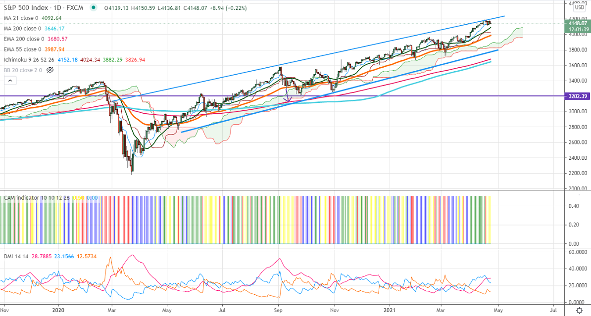 S&P500 has declined after hitting channel resistance 4185. The index halted its four weeks of bullishness on surge in coronavirus cases and the chance of higher taxes in the US. US president Joe Biden is planning to double the capital gain tax for a wealthy person. The US 10-year bond yield continues to trade lower for the past three weeks and hits a low of 1.53%. The S&P500 hits a low of 4124 and futures are trading at 4149.