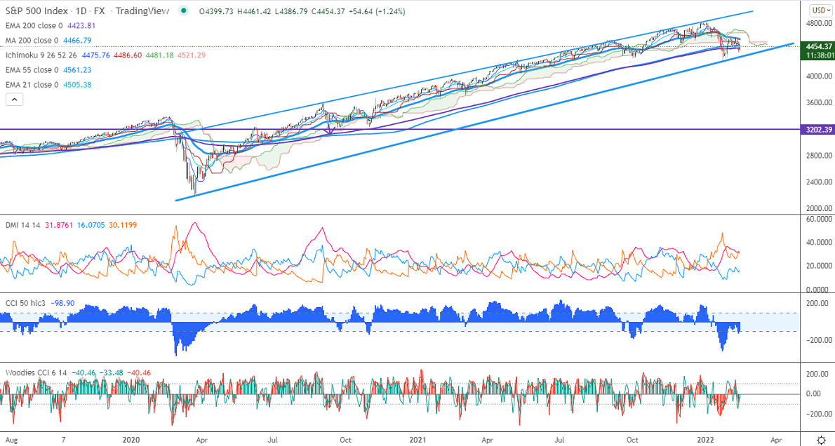 S&P500 regained above 4450 on easing geopolitical tension. According to sources, Russian western and southern armies near Ukraine are returning to bases. The demand for riskier assets surged after positive news. The index was one of the worst performers this year and lost more than 12% in hopes of aggressive rate hikes by the Fed. Markets eye US PPI and Empire State manufacturing index for further direction.