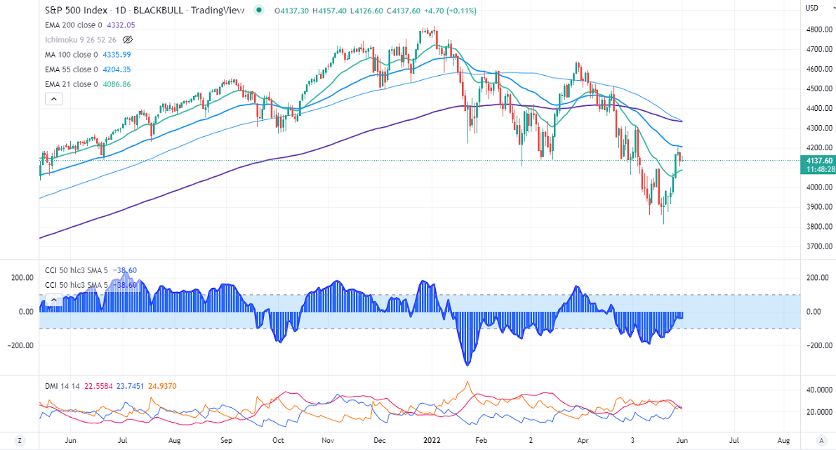 S&P500- The index formed a minor bottom around 3810 and showed a minor pullback of more than 400 points on upbeat market sentiment. US markets slumped sharply in May on weak earnings and rising inflation. A hawkish rate hike by Fed also puts pressure on global stock markets. According to the CME Fed watch tool, the probability of a 50 bpbs rate hike in Jun jumped to 97.7% from 93.3% a week ago.