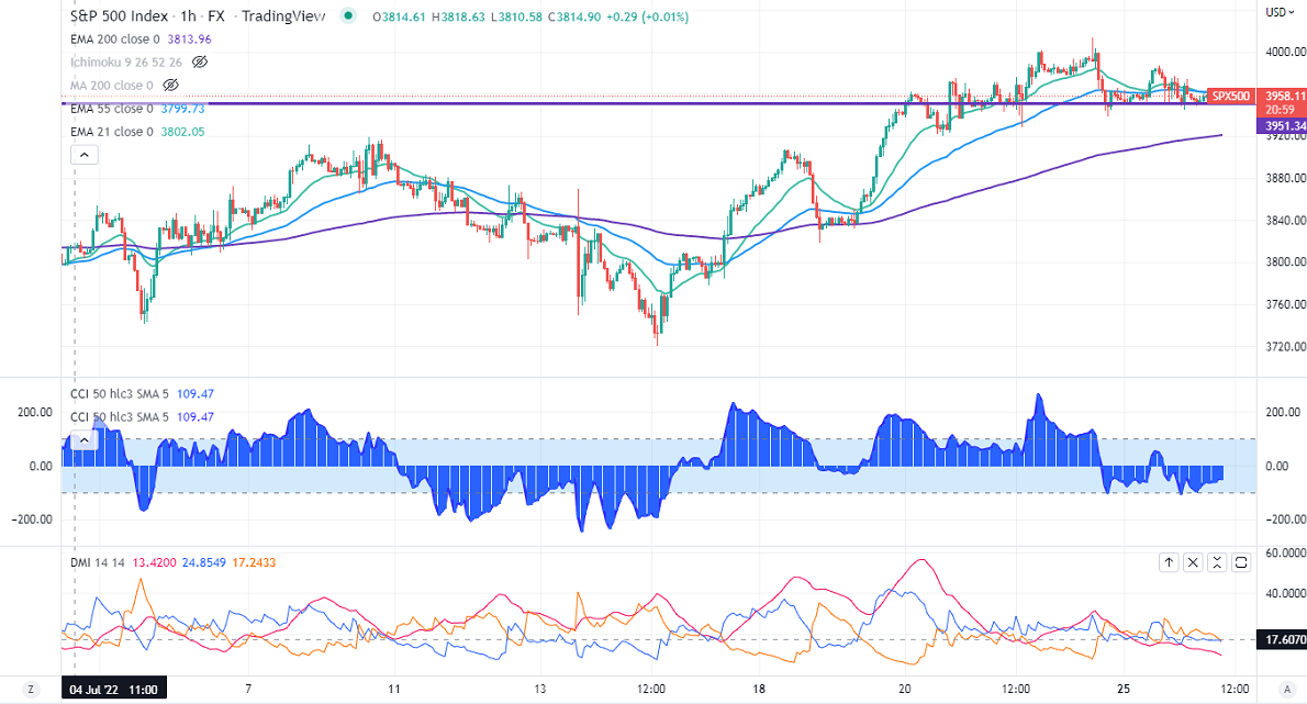 S&P500 trades flat after a pullback of more than 250 points from the minor bottom of 3720. The index was the worst performer this year and lost more than 20% from its high of 4811. It has formed a temporary bottom around 3632 and currently trading around 3957.