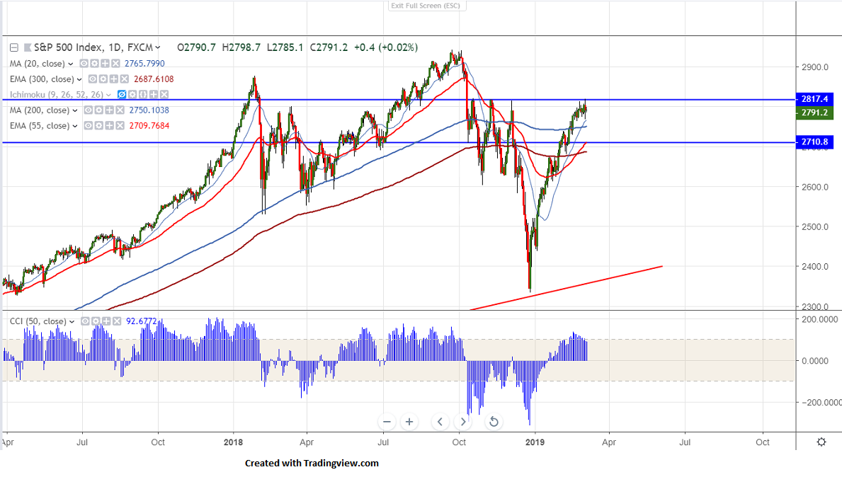 S&P500 has formed a triple top around 2820 and declined more than 50 points yesterday on account of weak US construction spending. The downside is limited on report that US President Trump and Chinese PM could reach a formal deal on summit to be held around Mar 27th 2019. The index recovered till 2798.70 and is currently trading around 2793.