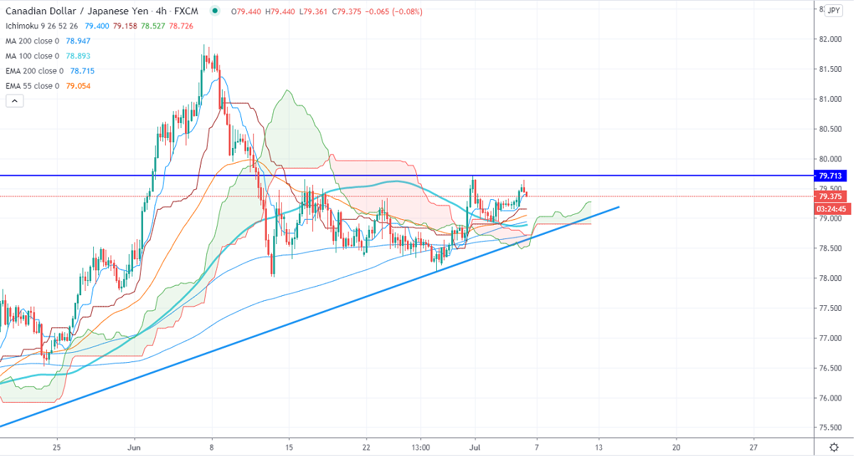 CADJPY recovered slightly after hitting a low of 78.95 on Jul 2nd, 2020. The intraday trend is weak as long as resistance 80 holds. The jump was mainly due to a slight bullishness in the Canadian dollar. USDCAD has halted its uptrend and lost more than 150 pips from high 1.37155 despite weak Canada GDP data. It came at -11.6% IN Apr, worst record decline due to the coronavirus pandemic.