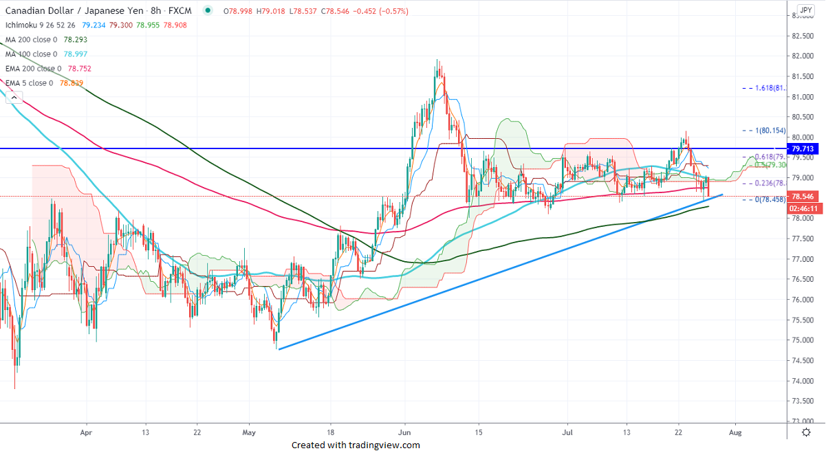 On the higher side, the pair is facing immediate at 79 (100- 8H MA) and any violation above will take the pair to the next level till 79.50/80.15/81.