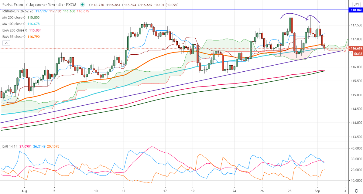 On the lower side, near-term intraday support is around 116.40 (trend line support) and any close below will drag the pair down till 116/115.17/114.95. The next primary resistance to be watched is 118 and break above that level targets 119/120.