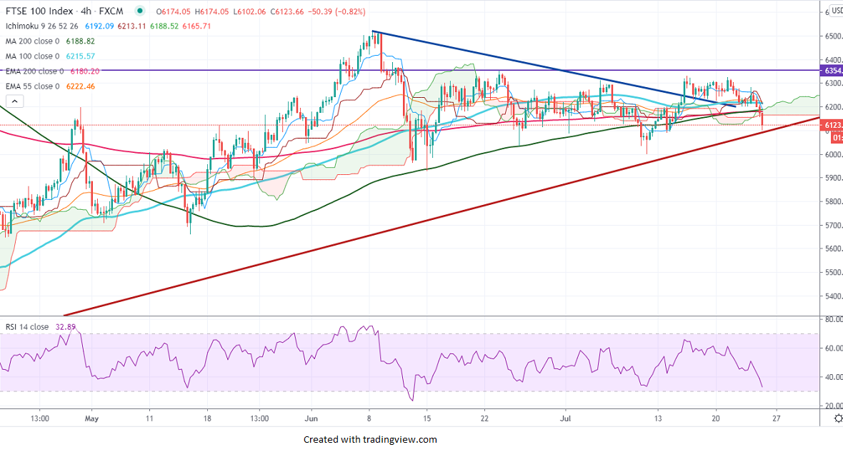 FTSE100 is trading weak for 4th consecutive days on US-China trade tension and an increase in coronavirus cases. China retaliated to US closure of the Houston consulate general. The US jobless claims rose more than expected for the first time four months and have increased the chance of a recession in the United States. The S&P futures are trading weak and lost nearly 0.50% from yesterday's close.