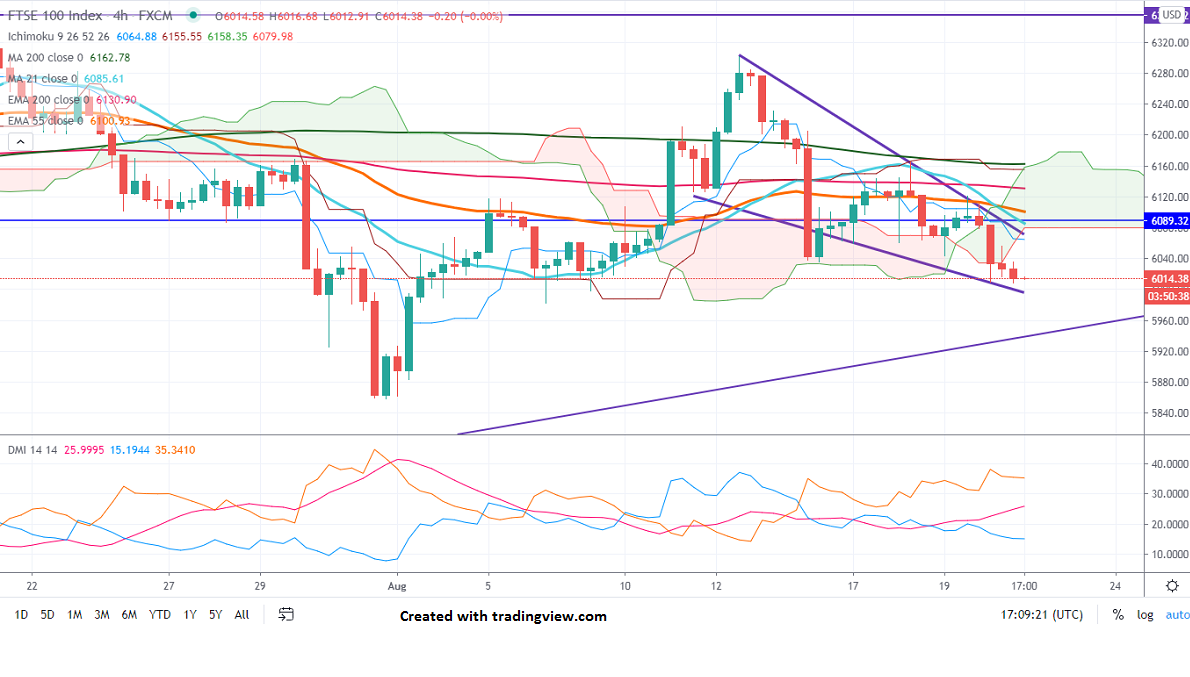 FTSE100 is trading weak for 2nd consecutive days and lost more than 150 points. The decline was mainly due to a slight dip in global stock markets after Fed meeting minutes. The Fed said that the uncertainty of the economic recovery due to COVID-19 remains "extremely elevated." US Fed members "agreed that the ongoing public crisis would weigh heavily on economic activity, employment, and inflation in the near term. Markets eye UK and EUE negations on Brexit this week for further direction. S&P is trading slightly lower and currently trading around 3371.