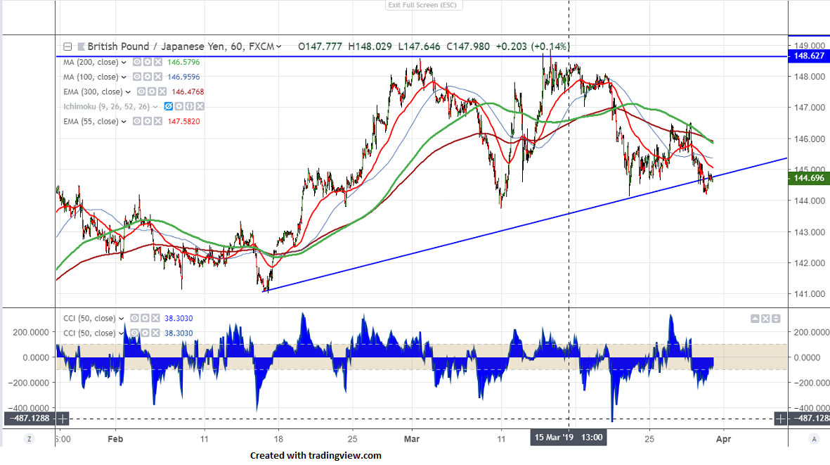 GBPJPY has once gain shown a minor recovery after hitting low of 144.20. The pair made low of 144.13 on Mar 21st 2019 and shown a jump till 146.51 level. Yesterday it declined below 200- day MA at 144.65 and closed well below that level. The Brexit uncertainty is putting pressure on this pair. It is currently trading around 144.75.