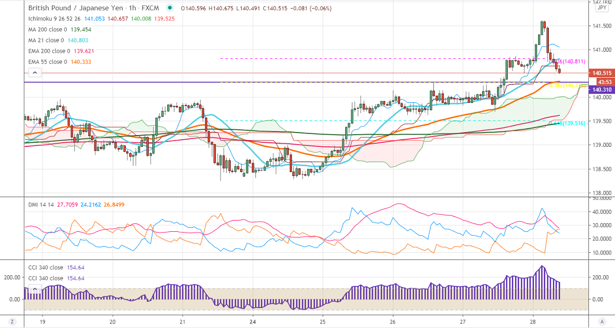 The 1-hour chart shows that the pair is holding below 21 MA. Any break below 140.50 will take pair till 139.97/139.30/138.25. The near term resistance is around 141.80, any break above targets 143./144.80.