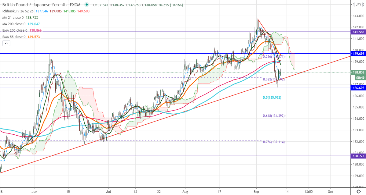 GBPJPY recovered sharply more than 150 pips from a low of 136.73. The slight jump in the Pound sterling due to broad-based US dollar selling and holding slightly above 1.300. Markets cautiously await Brexit talks and ECB monetary policy for further direction. The intraday trend of the Pound/Yen is bearish as long as resistance 139.05 holds.