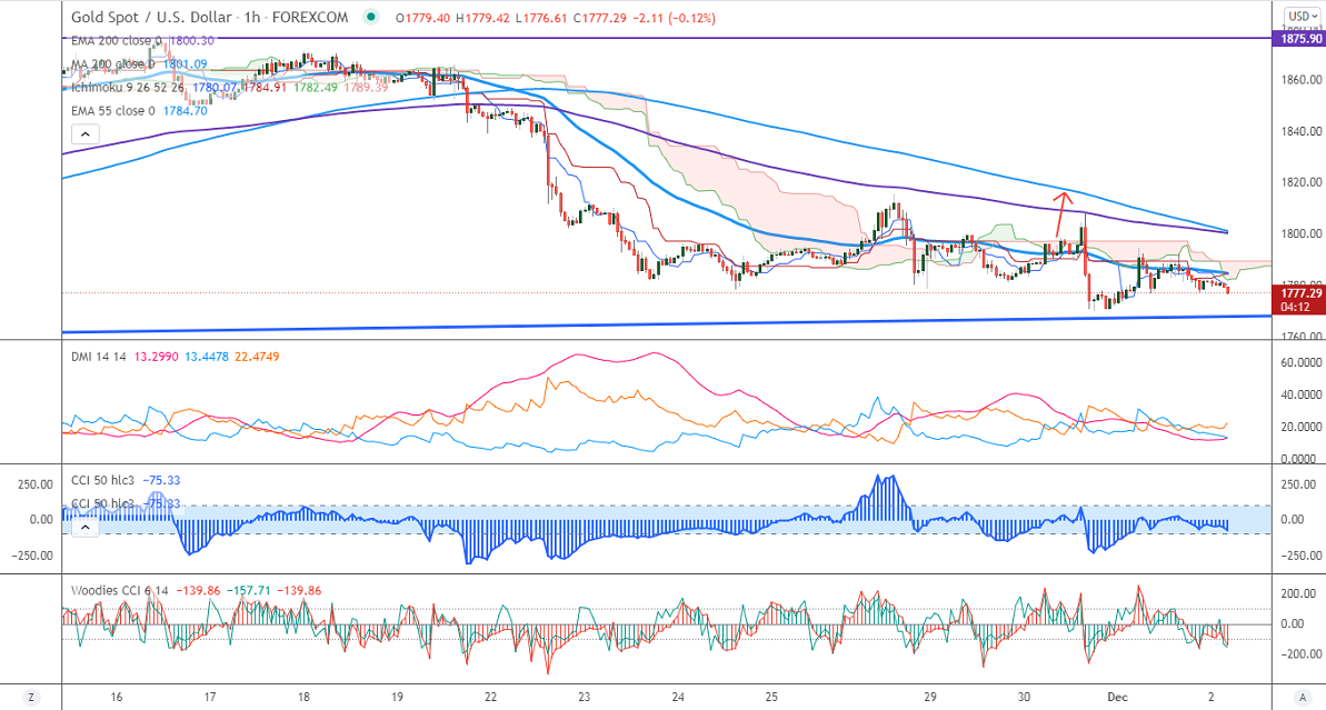 Gold has declined after a minor pullback to $1794.64.The yellow metal upside is capped as Fed members are open to faster tapering. US dollar index is trading in a narrow range between 96.64 and 95.67 in the past two days. The mild safe-haven demand increased after the US detected the first Omicron virus case. The yellow metal hits a low of $1776 yesterday and is currently trading around $1777.