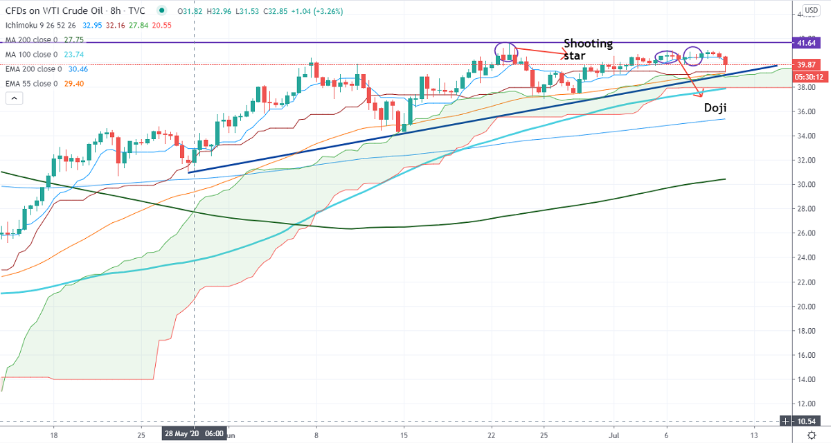 WTI crude oil has halted its 2 –week of an uptrend and shown more than $2 of decline. It was one of the best performers in the past 2-month and surged more than 550% from a low of $6.60 level. The increase in the number of new cases in major countries and surge in US crude inventories is putting pressure on crude oil.