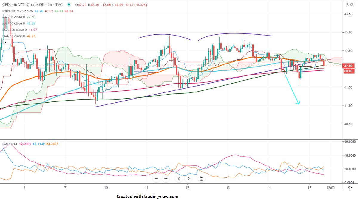 The pair is trading below 100- H MA, a significant move only if it breaks below $41.50. Any indicative violation below will drag the commodity to $40.50/$40.